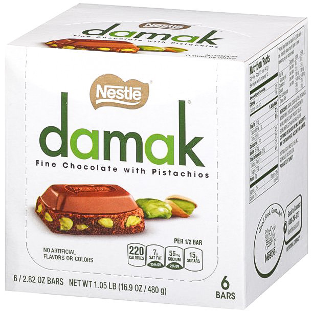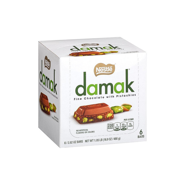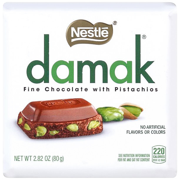 شکلات داماک شیرین با مغز پسته که از مدلهای بسیار خوشمزه و پرطرفدار صنعت شکلات میباشد و ترکیب شکلات با پسته واقعا فوق العاده میشود و پیشنهاد میکنیم حتما امتحانش کنید جزو اون دسته از شکلات هایی هست که نمیشه به سادگی از کنارش گذشت . شکلات نستله داماک پسته ای یک شکلات بسیار خوشمزه و خوش عطر محصولی از کارخانه بزرگ شکلات سازی نستله سوییس است. شکلات نستله داماک پسته ای در کارخانه نستله ترکیه تحت لیسانس سوییس تولید می شود. شکلات نستله داماک پسته ای با طعمی خوشمزه و لذیذ و به یاد ماندنی، یکی از محبوبترین و معروف ترین شکلات های جهان است. همچنین شکلات نستله داماک پسته ای برای تقویت حافطه مفید است.