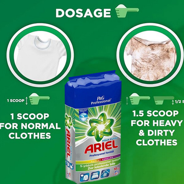پودر ماشین لباس شویی آریل وزن 10 کیلوگرمی با کیفیت ترین و اقتصادی ترین پودر لباس شویی در میان رقبای خود بوده و با قدرت پاکیزگی فروان با کمترین دز از این محصول میتونید تجربه ی شست و شوی کثیف ترین لکه رو از سخترین سطوح لباس تجربه کنید این پودر با قدرت بی نظیری در شست و شوی آب سرد دارد که حتی میتونید در آب سرد بهترین شست و شو رو تجربه نمایید و به بافت لباس ها در دمای بالا آسیب نرسانید