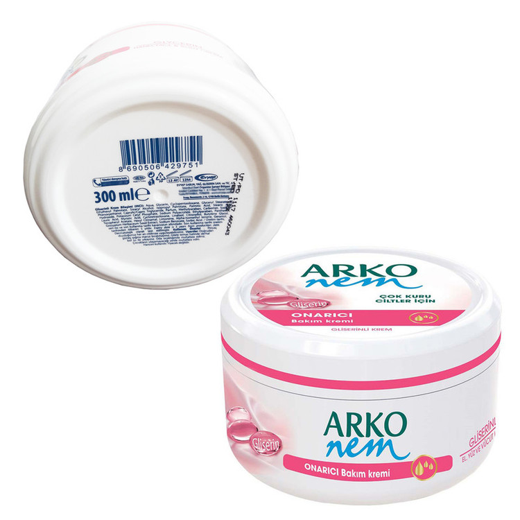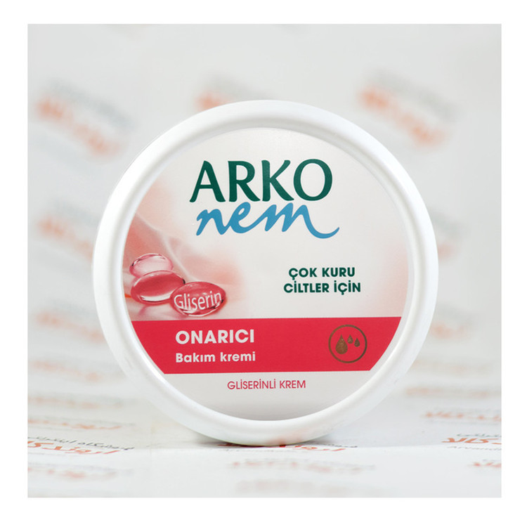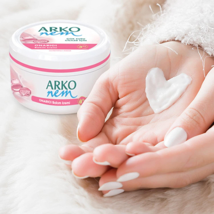 کرم مراقبت از پوست آرکو نم گلیسیرین به دلیل فرمول اضافی گلیسیرین خود ، در جلوگیری از خشک شدن دستها به شدت مراقبت می کند. گلیسیرین در فرمول خود رطوبت موجود در پوست را تضمین می کند و رطوبت پوست را به حداکثر می رساند. با شستشو و افزایش سن رطوبت پوست از بین میرود و خشکی و کشیده شدن پوست پدید میآید که به کمک کرم ترمیم کننده پوست دست، صورت و بدن گلیسیرین آرکو نم (ARKO NEM) که روی خود محصول نیز اشاره شده است به راحتی خشکی پوست برطرف میشود.پوست ما نیاز به مراقبت دارد و پوست دست شاید به دلیل اینکه بیشتر در معرض مواد شوینده، گرد وغبار و آلودگی است توجه مضاعفی را نسبت به پوست سایر قسمتهای بدن لازم داشته باشد. استفاده از مرطوب کنندهها میتواند برای پوست دست بسیار مفید باشد و از خشک شدن و پیری زودرس پوست آن جلوگیری کند. کرم دست، صورت و بدن آرکو نم (ARKO NEM) حاوی گلیسیرین گیاهی است که به نرم شدن و ترمیم کمک میکند. کرم ترمیم کنندهی پوست دست، صورت و بدن آرکو نم دارای ویتامین E است که به محافظت از پوست در برابر خشکی کمک میکند. ویتامین E میتواند در ترمیم بافتهای پوست تاثیر شگفت انگیزی داشته باشد و به سرعت پوست را تسکین دهد. کرم گلیسیرینهی آرکو سبک و دارای چربی مناسبی است که به سرعت جذب و به عمق پوست نفوذ میکند. کرم ترمیم کننده دست آرکونم به شکل کاسه ای و با حجم 300 میلی لیتر عرضه شده که بسیار مقرون به صرفه می باشد. با آبرسانی به پوست دست که زودتر از صورت پیر و میزبان چین و چروک میشود میتوان دستهایی زیبا و متناسب با سن و حتی جوانتر داشت. شرکت ترکیهای آرکو سابقه ای درخشان در تولید محصولات مراقبت از پوست دارد و سعی کردهاست با عرضهی محصولات متنوع اما با منشا گیاهی مصرف کنندگان بیشتری را به سمت محصولات خود فرا خواند. این شرکت برترین صادر کننده محصولات آرایشی و بهداشتی به اروپا می باشد.