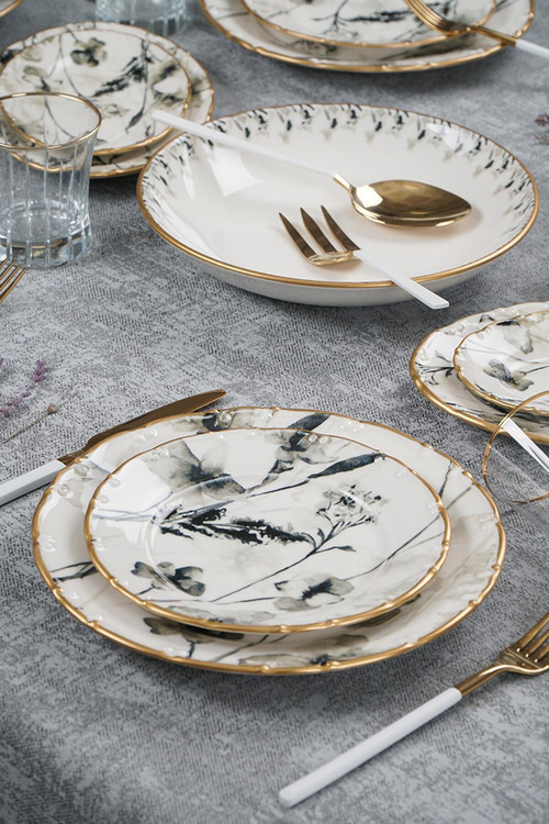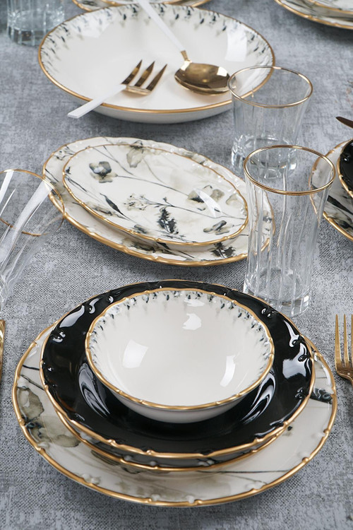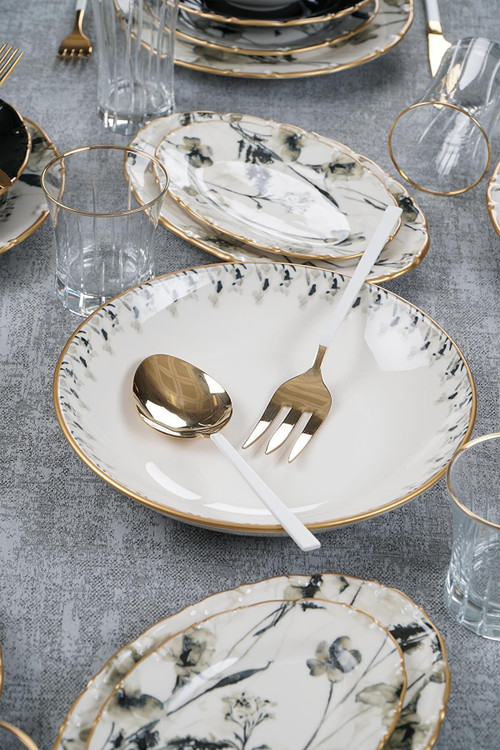 6 عدد پلوخوری / 6 عدد خورشت خوری / 6 عدد پیشدستی / 6 عدد پیاله / 2 عدد دیس بیضی کوچک / یک عدد دیس بیضی بزرگ