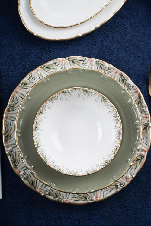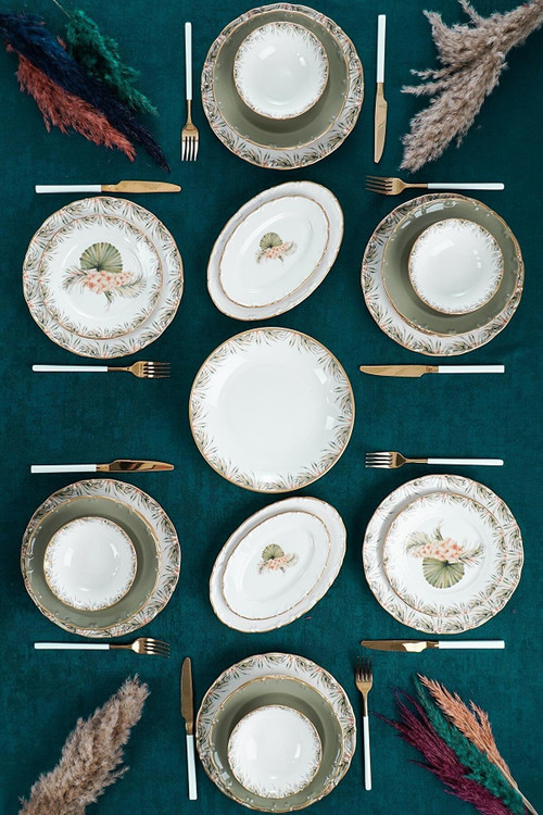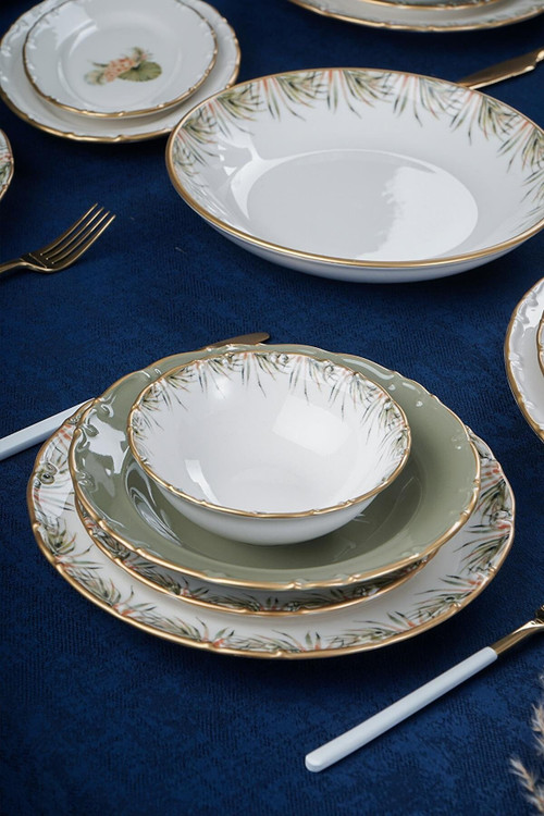 اقلام بسته بندی: 6 عدد پلوخوری / 6 عدد خورشت خوری / 6 عدد پیشدستی / 6 عدد پیاله / 2 عدد دیس بیضی کوچک / 2 عدد دیس بیضی بزرگ / یک عدد کاسه سالاد خوری