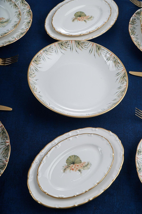 6 عدد پلوخوری / 6 عدد خورشت خوری / 6 عدد پیشدستی / 6 عدد پیاله / 2 عدد دیس بیضی کوچک / 2 عدد دیس بیضی بزرگ / یک عدد کاسه سالاد خوری