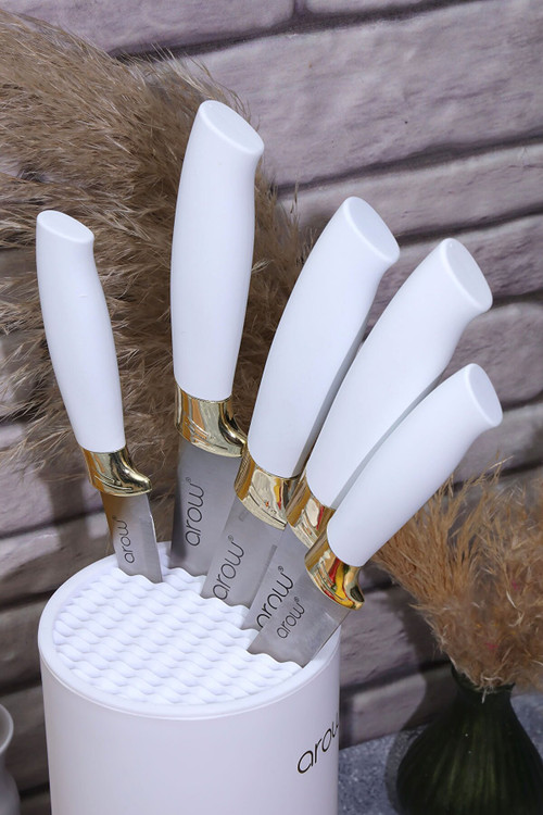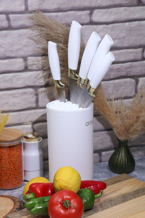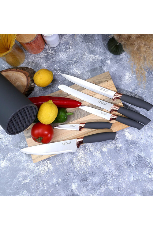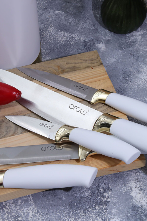 اقلام همراه محصول: چاقوی سرآشپز 33 سانتی متری / چاقوی خرد کردن 32.5 سانتی متری / چاقوی نان 33 سانتی متری / چاقوی خرد کردن 23 سانتی متری / چاقوی پوست کندن 20 سانتی متری