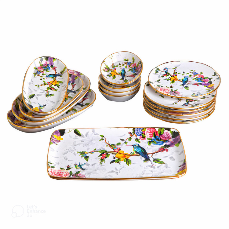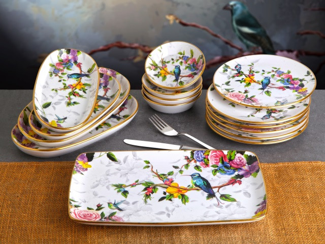 مجموعه بسیار نفیس 15 پارچه صبحانه خوری گونول محصول کشور ترکیه بوده و شامل 6 عدد بشقاب صبحانه خوری 20 سانتی متریو 4 عدد پیاله 12 سانتی متری و 1عدد سینی (دیس)32x20 سانتی متر و یک عدد دیس بیضی 21x12 سانتی متر و 2عدد دیس بیضی 27x15 سانتی متر میباشد