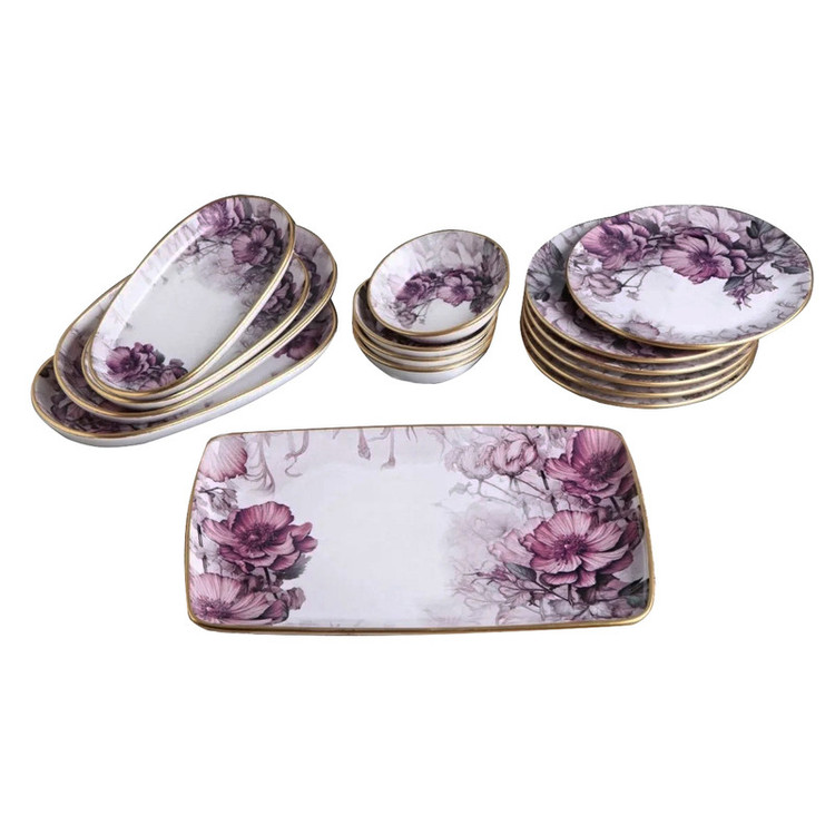 مجموعه بسیار نفیس 15پارچه صبحانه خوری گونول محصول کشور ترکیه بوده و شامل 6 عدد بشقاب صبحانه خوری 19 سانتی متری و 4 عدد پیاله 10 سانتی متری و 1عدد سینی (دیس)21x33 سانتی متر دو عدد دیس بیضی 11x20 سانتی متر و 2عدد دیس بیضی 14x24 سانتی متر میباشد