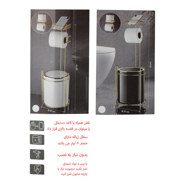 محصول کشور ترکیه - کاملا ضد زنگ - تلفن همراه یا کاغذ دستمالی را میتوان در قفسه بالایی قرار داد - سطل زباله دارای حجم 5 لیتر میباشد - بدون نیاز به نصب - با برس و مواد شیمیایی تمیز نکنید در صورت نیاز با پارچه صابونی تمیز کنید